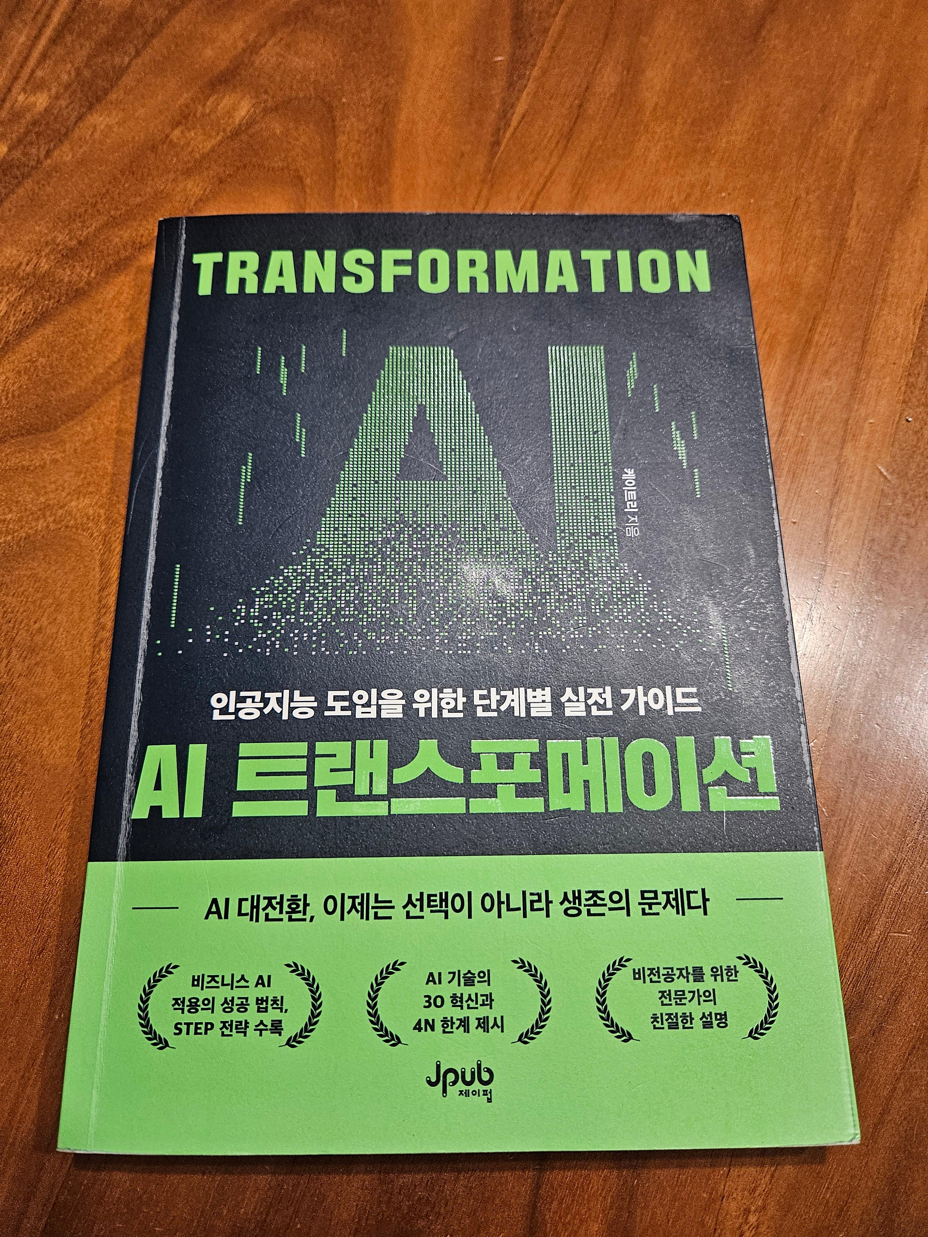 요즘 AI 를 하지 않을 수 없는 상황에서 고민이 많다면 “AI 트랜스포메이션" 은 일반적인 안내서 보다 좀 더 AI 대전환을 실행시키는 구체적인 방안을 보여줘요.